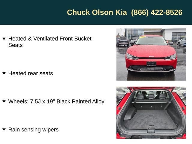 Apple CarPlay & Android Auto, Blind-Spot Warning, C L E A N-CARFAX, Heated & Ventilated Front Bucket Seats, Heated rear seats, LOCAL Area Vehicle, Memory seat, ONE OWNER, Power Liftgate, Radio: Meridian Premium Audio System, Rain sensing wipers, Wheels: 7.5J x 19 Black Painted Alloy.Kia Certified Pre-Owned Details:* Vehicle History* Roadside Assistance* Transferable Warranty* Warranty Deductible: $50* Limited Warranty: 12 Month/12,000 Mile (whichever comes first) Platinum Coverage from certified purchase date* Includes Rental Car and Trip Interruption Reimbursement. 3 month Sirius trial subscription* 165 Point Inspection* Powertrain Limited Warranty: 120 Month/100,000 Mile (whichever comes first) from original in-service date2023 EV6 Kia Wind AWD 1-Speed Automatic
