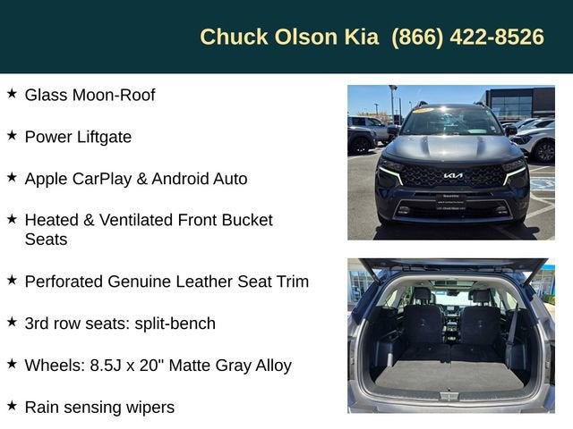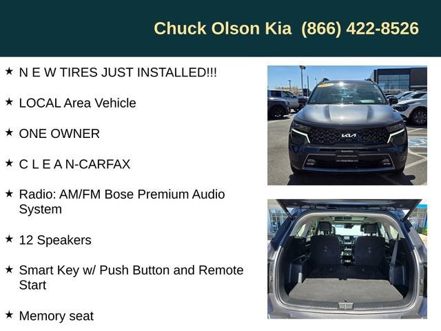 AWD, 12 Speakers, 3rd row seats: split-bench, Apple CarPlay & Android Auto, C L E A N-CARFAX, Glass Moon-Roof, Heated & Ventilated Front Bucket Seats, LOCAL Area Vehicle, Memory seat, N E W TIRES JUST INSTALLED!!!, ONE OWNER, Perforated Genuine Leather Seat Trim, Power Liftgate, Radio: AM/FM Bose Premium Audio System, Rain sensing wipers, Smart Key w/ Push Button and Remote Start, Wheels: 8.5J x 20 Matte Gray Alloy.Kia Certified Pre-Owned Details:* 165 Point Inspection* Powertrain Limited Warranty: 120 Month/100,000 Mile (whichever comes first) from original in-service date* Transferable Warranty* Roadside Assistance* Warranty Deductible: $50* Includes Rental Car and Trip Interruption Reimbursement. 3 month Sirius trial subscription* Vehicle History* Limited Warranty: 12 Month/12,000 Mile (whichever comes first) Platinum Coverage from certified purchase date2023 Sorento Kia X-Line SX Prestige 8-Speed DCT